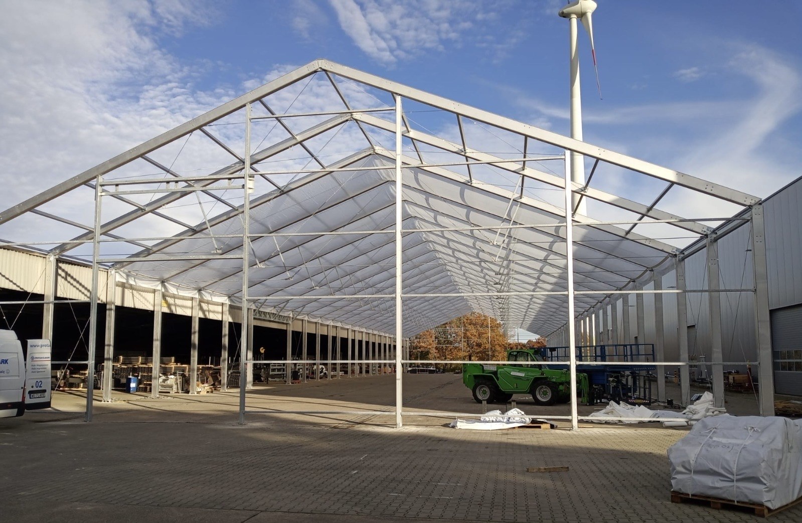 Die Konstruktion unserer Zelthallen / Industriezelte / Lagerzelte basiert auf hochwertigen Aluminiumprofilen, die mit feuerverzinkten Stahlelementen kombiniert werden, um Stabilität und Langlebigkeit zu gewährleisten.