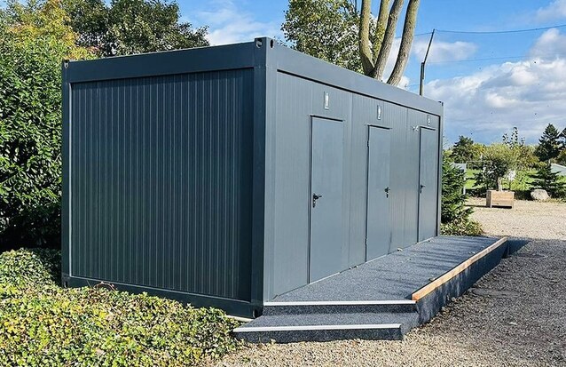 Sanitärcontainer für Wohnmobilstellplatz Großenbrode / Ostsee mit Urinalen, WC, Duschen und Handwaschbecken gefertigt und montiert von Hacobau GmbH.