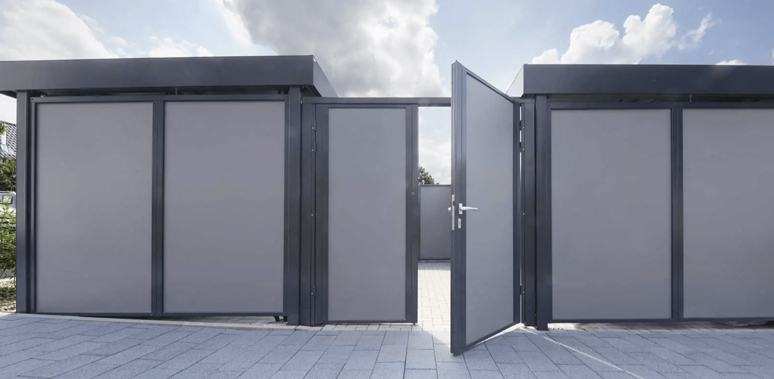Mit Drehflügel- und/oder Schiebetüren lieferbar. Je nach Anforderung kann die Einhausung mit einer Drehflügeltüre oder (elektrisch angetriebenen) Schiebetüre ausgestattet werden. Selbstverständlich können auch in einer Einhausung beide Türarten zum Einsatz kommen. Die Öffnungsbreiten sind so gewählt, dass Fahrräder, Mülltonnen etc. bequem durchgeschoben werden können. Keine Tür notwendig? Dann wird aus der Einhausung kurzerhand ein Unterstand.