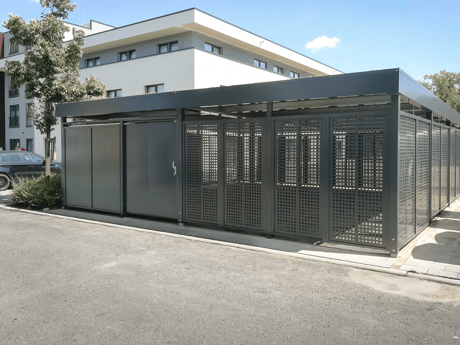 - Modularer Aufbau für verschiedene Nutzungsformen (z. B. Fahrradparker Depot Müllbehälter). Dachbegrünung möglich. Optional Erhöhung der Dachlast für bauseitige Montage einer Fotovoltaikanlage.