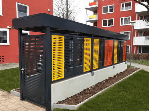 In immer mehr Wohngebieten sind feste Unterstellmöglichkeiten für Fahrräder, Lastenräder, Mülltonnen etc. seitens der Behörden vorgeschrieben. Die Einhausungen von Hacobau bieten hier die ideale Möglichkeit, Vorschriften nicht nur umzusetzen, sondern auch mit modernem Design zu kombinieren. Der Zugang erfolgt über eine einfache oder doppelte Drehflügeltüre – die Sichtschutzelemente aus dem Einhausungsprogramm runden das ganze System optisch ab. Selbstverständlich sind auch die Einhausungen auf Maß und in beliebiger Stückzahl lieferbar.