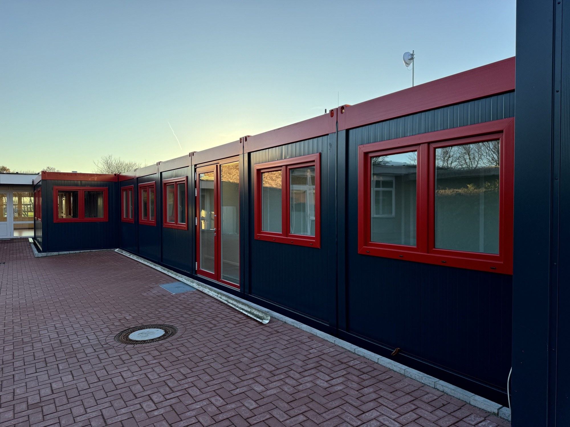 Mannschaftscontainer / Aufenthaltscontainer / Sanitärcontainer / Bürocontainer angebaut an neue Feuerwehrfahrzeughallen von Hacobau GmbH für Feuerwehr, Fehmarn.