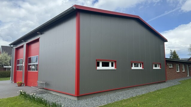 Fahrzeughallen / Feuerwehrgerätehäuser in klassischer Stahlpaneelbauweise. Modulare Rettungswachen und Feuerwachen.