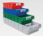Zur übersichtlichen und systematischen Lagerung von Kleinteilen. Verschiedene Längen, Breiten und Höhen. Abnahme nur in Verpackungseinheiten. Etiketten für Regalkästen passend geschnitten in drei Breiten, beschreib- und bedruckbar aus weißem Papier und transparentem Kunststoff als Schutz erhältlich.