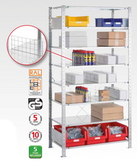 Optimale Sortierung durch horizontal verstellbare Drahtsteckgitter. 8 Fachböden mit 15 Drahtsteckgittern 140 mm hoch, in allen Ebenen in die Systemlochung einsetzbar. Regal verzinkt, Drahtsteckgitter glanzverzinkt. Ebenen im Raster von 25 mm in der Höhe verstellbar. Fachlast 150 kg, Feldlast 1,4 Tonnen. Höhe: 2000mm Breite 1000mm Tiefe 400mm, 500mm und 600mm.