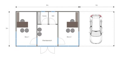 Der Verkaufspavillon / Büropavillon als Doppelanlage mit den Abmessungen 6x6m bietet genügend Raum für 2 bis 3 Arbeitsplätze, einer großen Bedientheke oder Sitzflächen für Besucher. Um die Privatsphäre Ihrer Kunden bei sensiblen Vorgängen wie beispielsweise Finanzierungen zu schützen, können optional Trennwände in die Raummodul-Anlage eingezogen werden. Durch große Glasflächen wird dabei die offene und einladende Wirkung gewahrt.